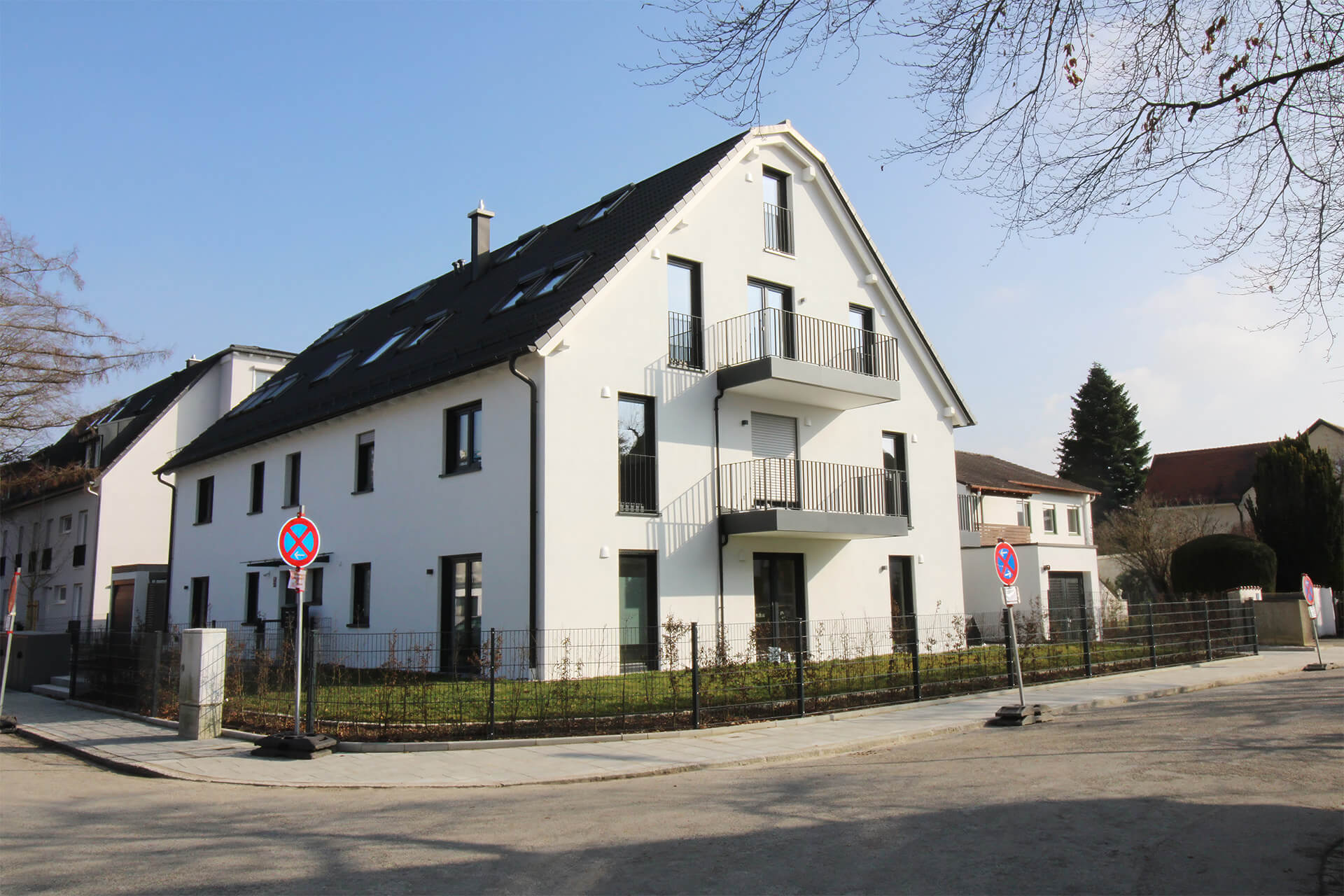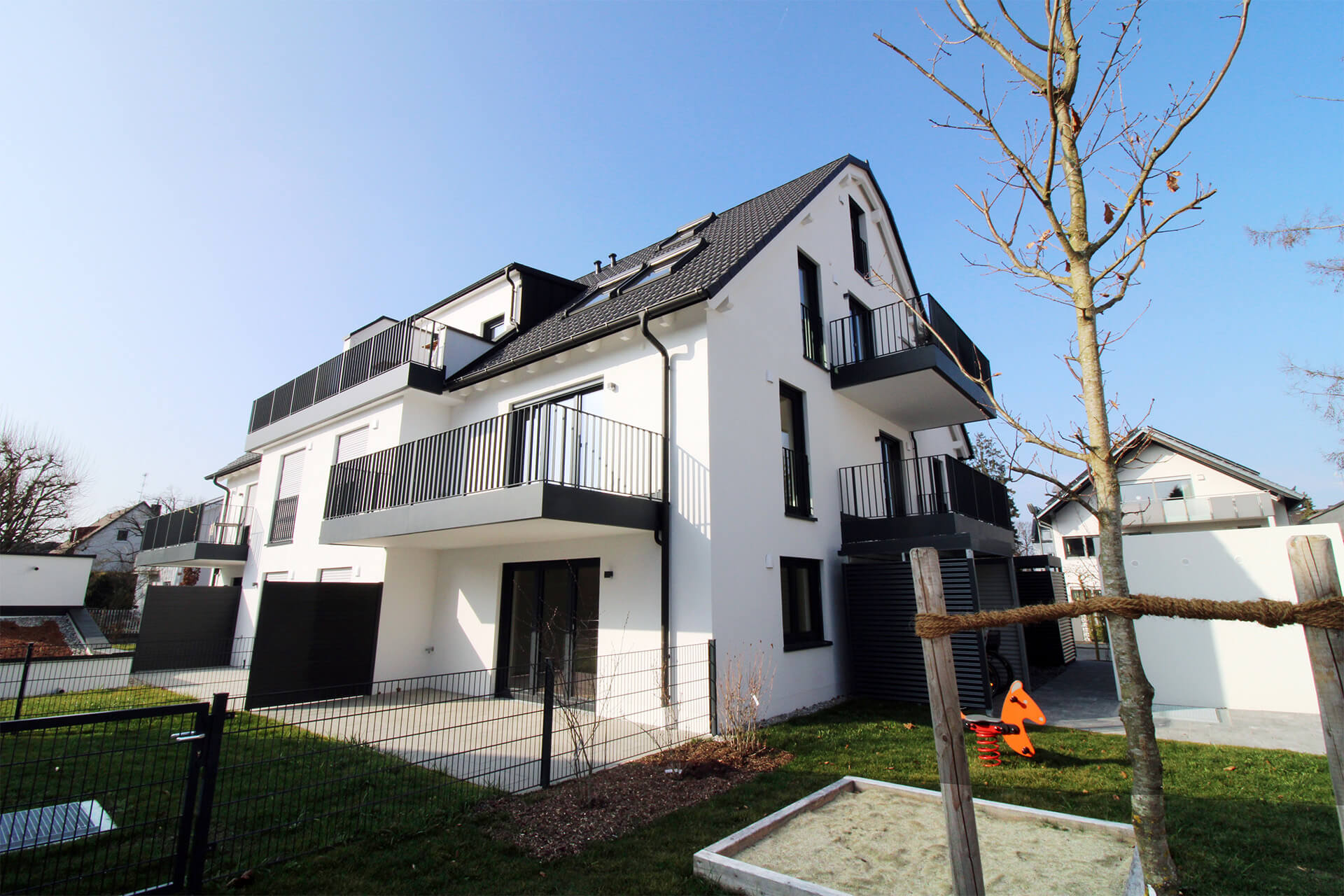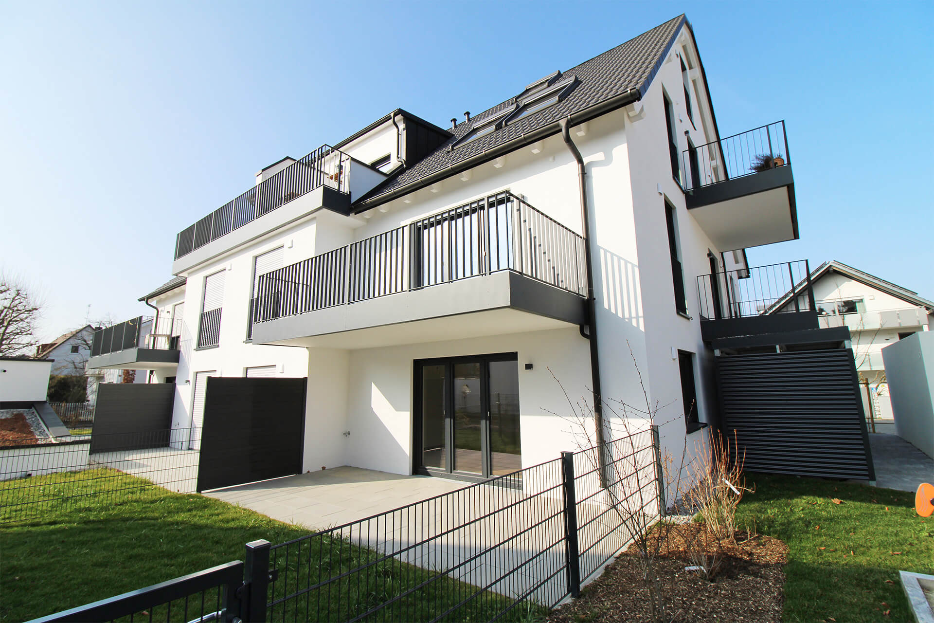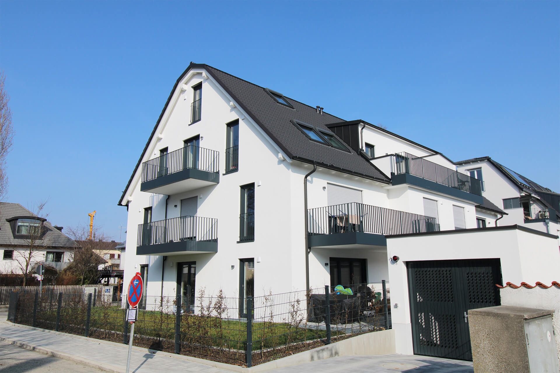 | Architektur | Elegantes Stadthaus für 8 Familien, Baujahr 2025, modern, anthrazitfarbene Akzente |